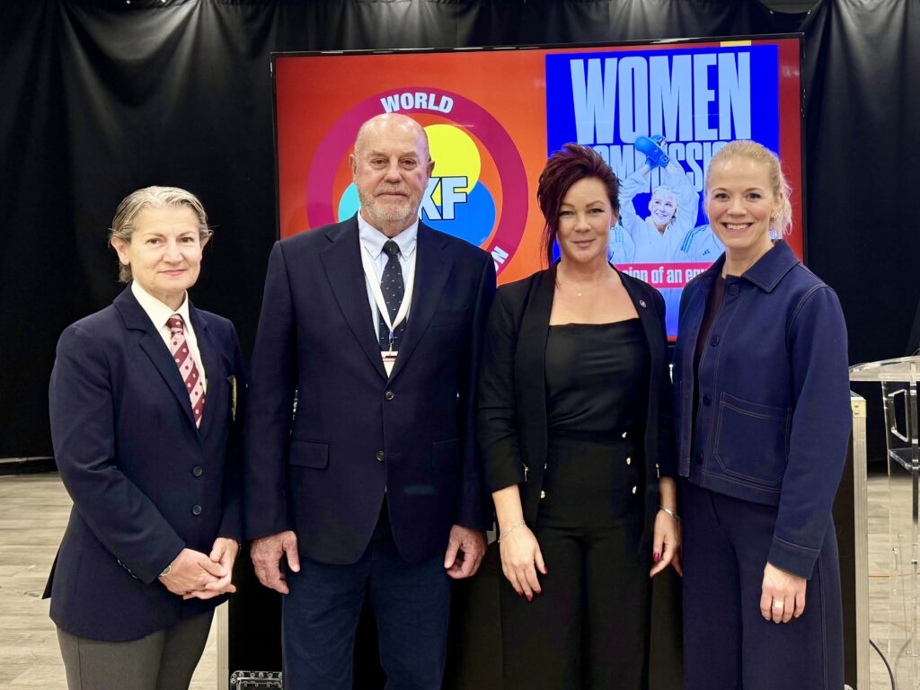 Toppbild, fr.h: Karin Hägglund, Sarah Wennerström, WKFs ordförande Antonio Espinos samt ledamot i Womens Commission Fariba Mahdani.
